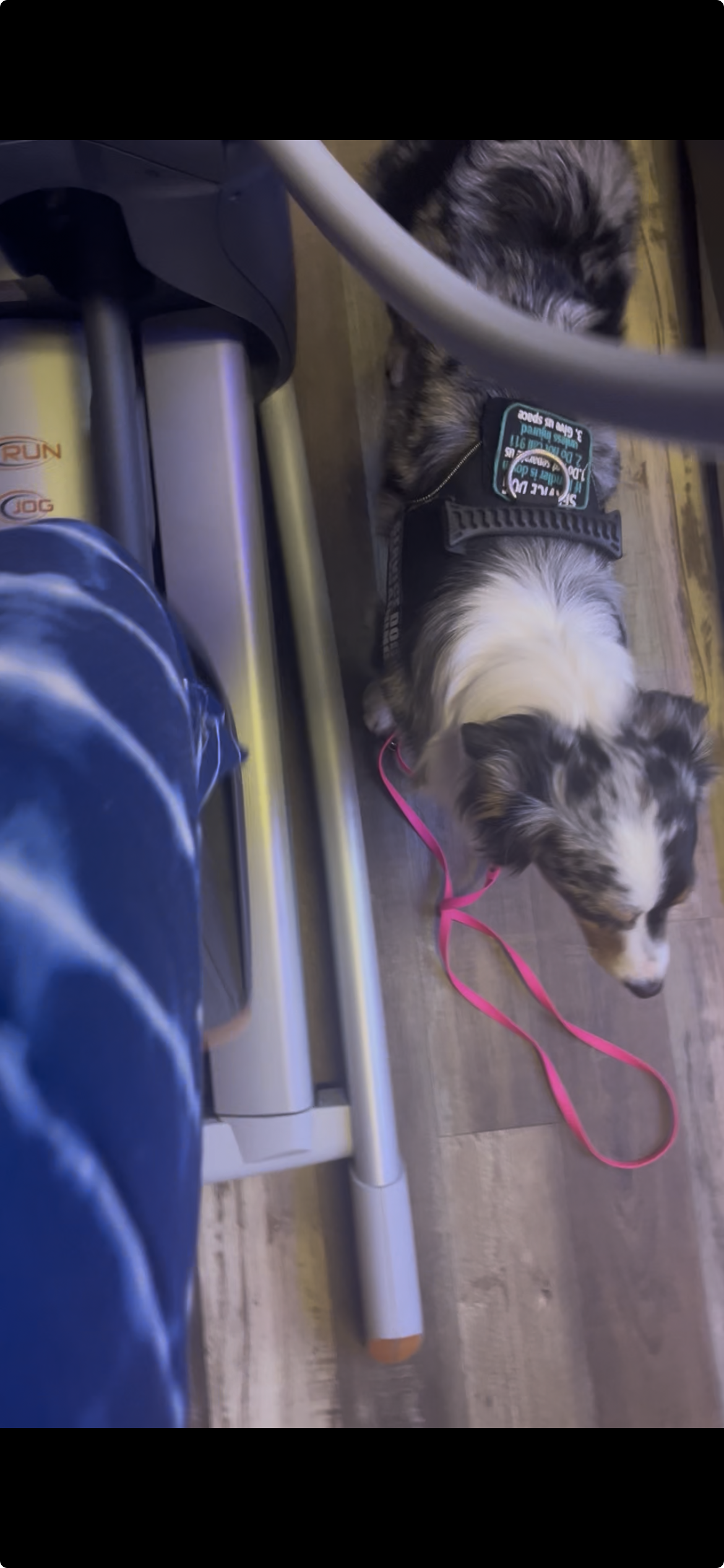 We were at the gym and I was trying out a new elliptical.  I told her to  settle, she didn't. I told hr to lay down, she didn't. Then I realized that she was saying that to obey would not be doing her job, so I allowed her to make that call. In the service dog world, this is called Intelligent disobedience: a trained behavior where a service dog refuses a handlers command to ensure safety. You see, I have passed out many times on similar equipment. She has saved me from getting another concus...